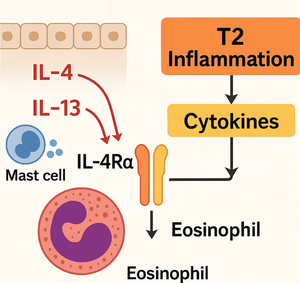 2.治疗前IgE水平较低 超级应答者基线IgE平均值为145 kU/L,其他患者平均为313 kU/L。较低的IgE可能意味着过敏机制参与程度较轻,药物对IL-4/IL-13通路的阻断更容易起效。 3.近期曾接受鼻窦手术 超级应答者上次手术距今平均约2.5年,其他患者平均约4年。近期手术可能意味着鼻腔结构更通畅、炎症负担相对较轻,有利于药物发挥调节作用。 二、慢性鼻窦炎伴鼻息肉超级应答者 度普利尤单抗通过阻断IL-4受体,同时抑制IL-4与IL-13信号,从而控制T2型炎症。 上述特征共同指向一点:这类患者的炎症类型更典型、更集中于T2通路,且全身炎症负担相对较低。因此,在药物作用下,他们的嗅觉恢复更快、息肉消退更明显,症状缓解也更持久,甚至有望拉长用药间隔。