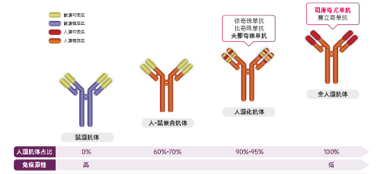 1. 全人源抗体:司库奇尤单抗治疗银屑病疗效好且安全 单克隆抗体从鼠源发展到全人源,免疫原性降低、安全性提高。全人源抗体由人类抗体基因编码,是未来单抗主要方向。药物免疫原性会诱发抗药抗体(ADA),影响疗效和安全性,临床需低免疫原性治疗药物。