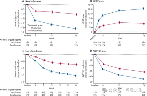 在鼻塞评分、嗅觉丧失评分、总症状评分、22项鼻窦结局测试(SNOT-22)及鼻吸气峰流量等维度,度普利尤单抗组均显著优于奥马珠单抗组(p<0.0001)。例如,SNOT-22评分组间差异-12.70分,鼻吸气峰流量多改善31.27L/min,均远超公认最小临床重要差异阈值。