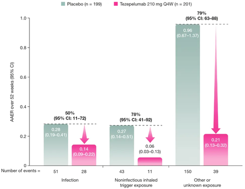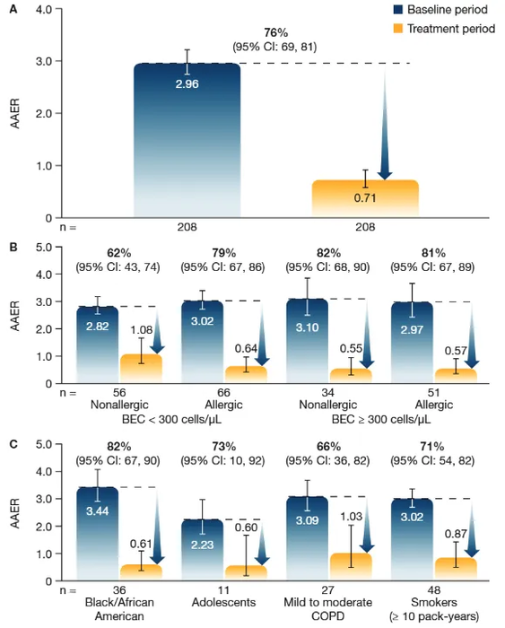 另一项在美国真实世界进行的研究中期结果也给出了积极信号。在接受特泽利尤单抗治疗后,不同特征的重度哮喘患者群体的急性发作率平均降低了76%,同时肺功能、哮喘控制水平和生活质量评分也获得了具有临床意义的改善。