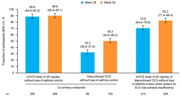 对于长期依赖口服糖皮质激素来控制病情的重度哮喘患者,减少激素用量是一个关键治疗目标。一项专门的研究评估了特泽利尤单抗在这方面的作用。结果显示,治疗52周后,近90% 的患者能够将每日口服激素剂量稳定降至较低水平,其中一半的患者成功完全停用口服激素,且哮喘病情并未失控。