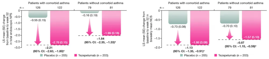 二、特泽利尤单抗对哮喘合并鼻息肉 双重症状同步改善 慢性鼻窦炎伴鼻息肉(CRSwNP)与哮喘常常共存,尤其是重度哮喘患者,两者并存的比例较高,严重影响生活质量。 一项Ⅲ期研究评估了特泽利尤单抗对重度CRSwNP患者的疗效。结果显示,无论患者是否同时患有哮喘,该药物均能显著缩小鼻息肉体积,并改善患者自我报告的鼻塞症状。 对于同时患有哮喘的这部分患者,研究带来了更积极的消息:在鼻部症状获得改善的同时,他们的哮喘控制问卷评分也优于接受安慰剂的患者,且哮喘急性发作率更低。这提示特泽利尤单抗可能对上下呼吸道的炎症均有积极作用。