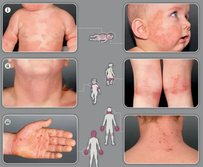 三、特应性皮炎不同年龄段症状不同 疾病的典型表现随年龄而变化,但核心症状始终是瘙痒。 婴儿期:皮疹多出现在脸颊、头皮和四肢伸侧。 儿童期:常集中于肘窝、膝窝(腘窝)等身体屈侧部位。 成年后:仍好发于屈侧,但颈部、手部及面部也可能受累,皮肤常因长期搔抓而变得肥厚、粗糙。 除了皮疹,许多患者还伴有皮肤整体干燥、眶下皱褶、掌纹增多等特征。