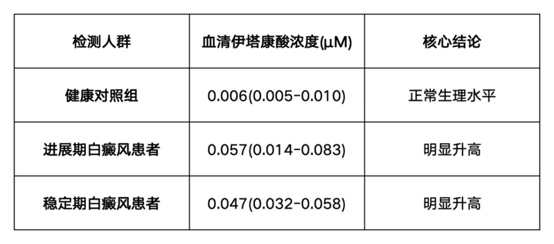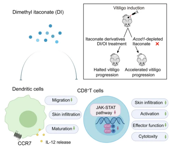 最近,一项重要的科学研究取得了关键进展。研究发现,一种叫二甲基衣康酸酯的小分子化合物,能够同时作用于上述两种关键免疫细胞,在实验中有效阻止了白斑扩散,甚至帮助皮肤颜色恢复。 一、白癜风患者衣康酸水平为何升高?身体自我保护还是失效? 研究首先注意到,白癜风患者血液里一种叫衣康酸的代谢物水平,比健康人高。这其实可能是身体试图对抗疾病的一种自我保护反应。动物实验证实了这个猜想:如果让小鼠失去产生衣康酸的能力,它们的白癜风会发展得更快、更严重。这说明,身体自己产生的衣康酸,本身是在努力保护黑色素细胞的。