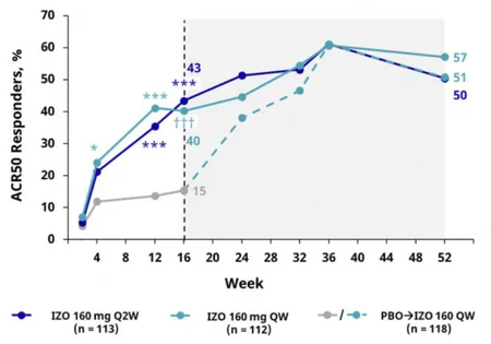 这项研究为期52周的数据显示: 持续症状控制:ACR 20/50/70应答率从第16周起持续优于安慰剂组。